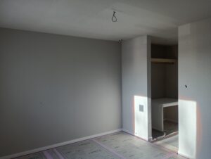 2階のクロスが張り終わり、1階はクロスを張る前の下地処理(パテ処理)を行っていました。