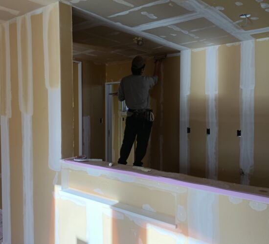 2階のクロスが張り終わり、1階はクロスを張る前の下地処理(パテ処理)を行っていました。