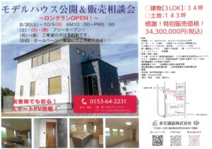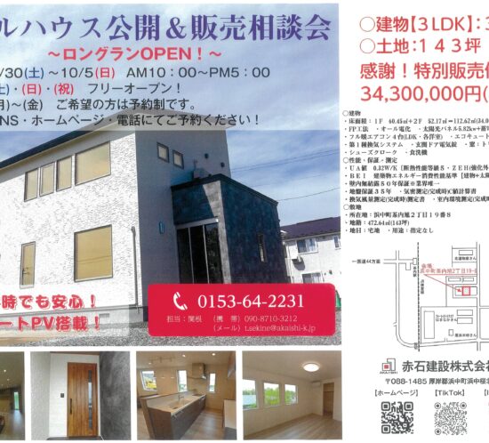 浜中町茶内にあるモデルハウスの公開と販売相談会を8月30日(土)~10月5日(日)までロングランで行います。