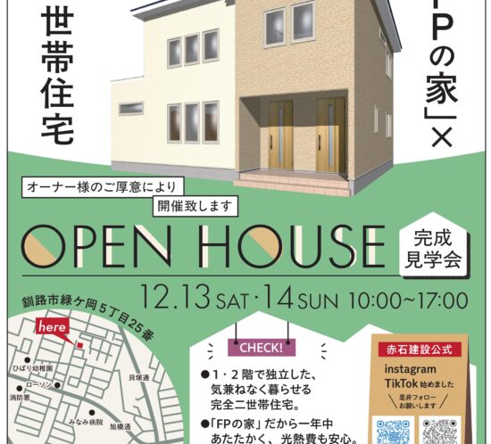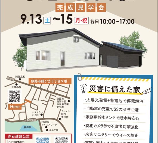 9月13・14・15日(土・日・祝)の3日間、オーナー様のご厚意により鶴ケ岱3丁目9番にある会場で完成見学会を行います。