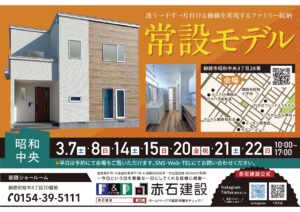 先月から公開しているモデルハウスを特別価格で販売いたしますので、この機会に是非ご来場ください。